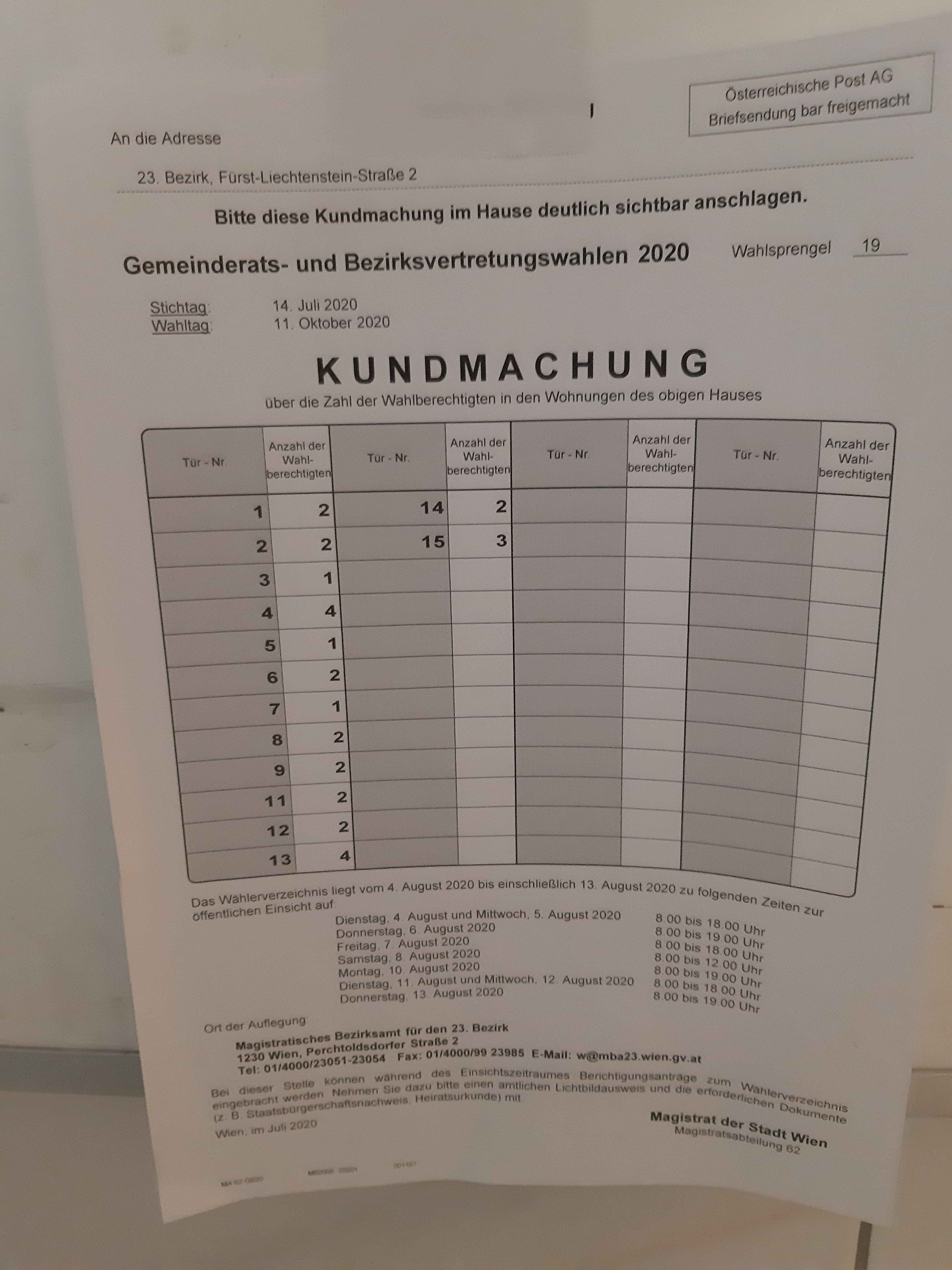 Très pratiques aussi les modalités très flexibles du vote du vote « anticipé » (le vote par procuration n’existe pas en Autriche) : par correspondance, mais aussi directement dans les service du « Magistrat », l’administration locale.