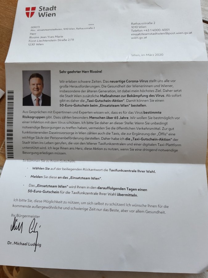 Confinement Covid 19 – Courrier du bourgmestre de Wien aux plus de 65 ans